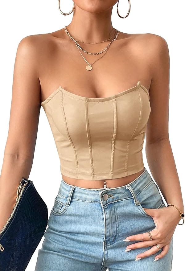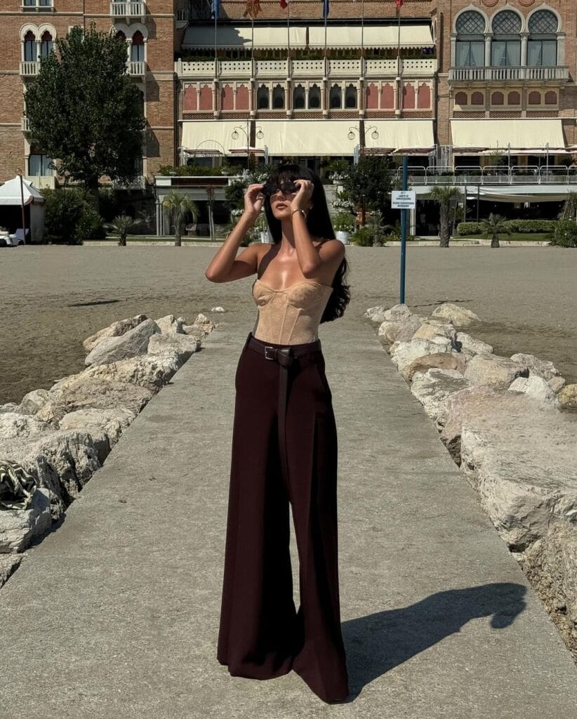 @ paola_cossentinoWide-leg burgundy trousers paired with a beige corset top exude confidence and elegance.
