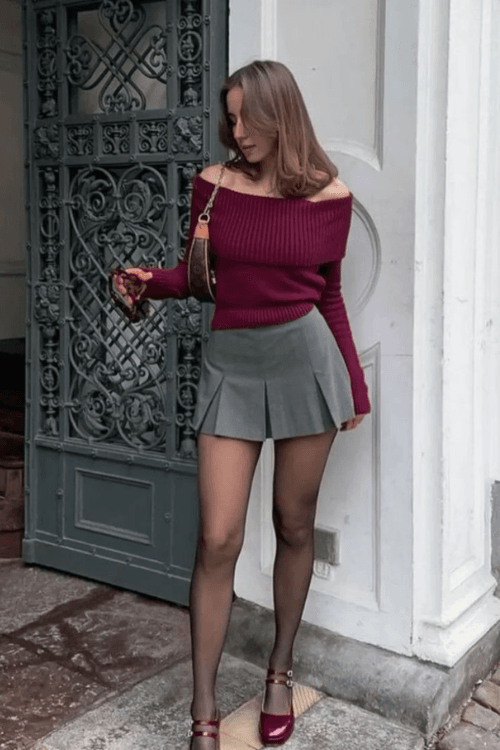 @ florabae.__The off-shoulder burgundy knit paired with a pleated gray skirt brings a flirty and fun vibe to this outfit.