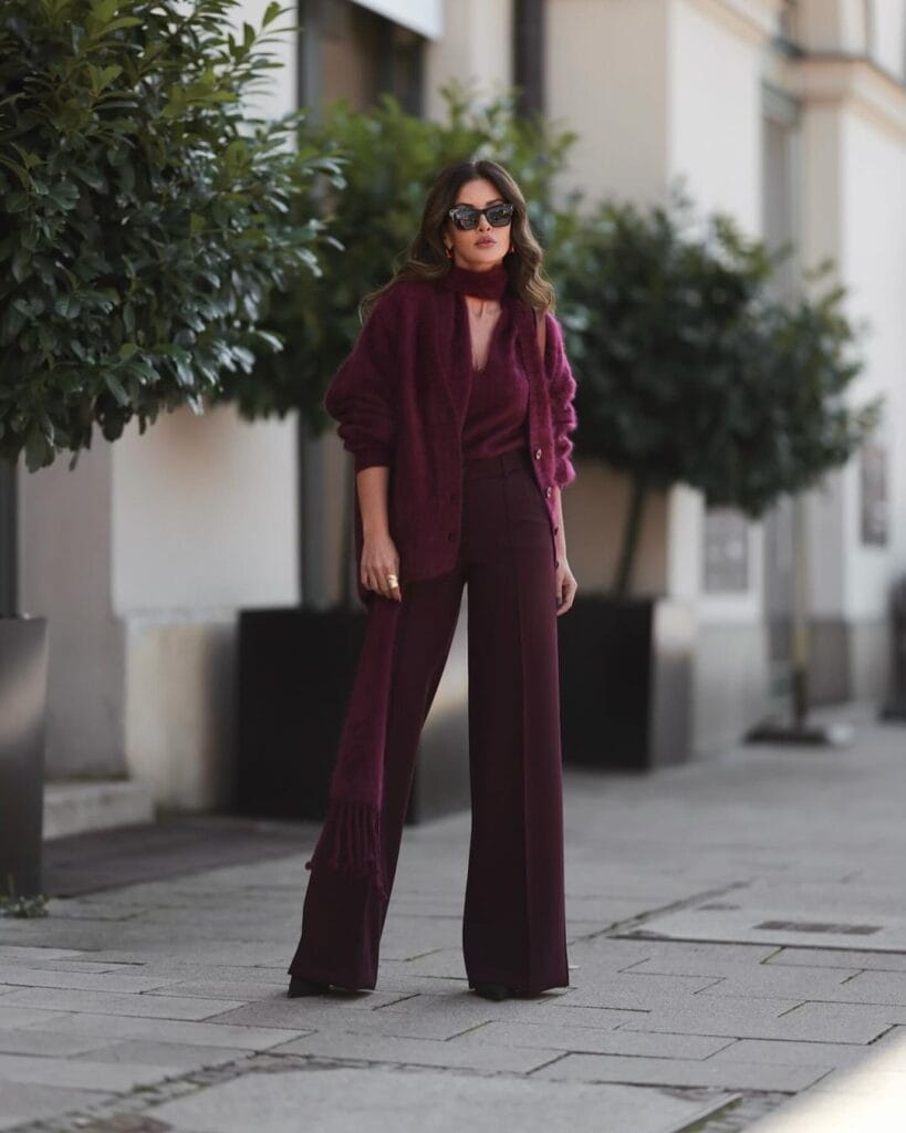 @ fusunlindnerA soft cardigan matched with high-waisted burgundy trousers creates a sleek, streamlined look.