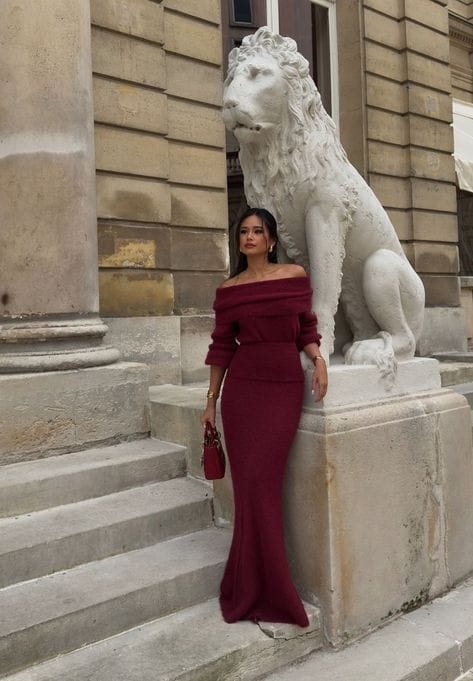 An off-the-shoulder burgundy maxi dress is the epitome of sophistication for formal occasions.