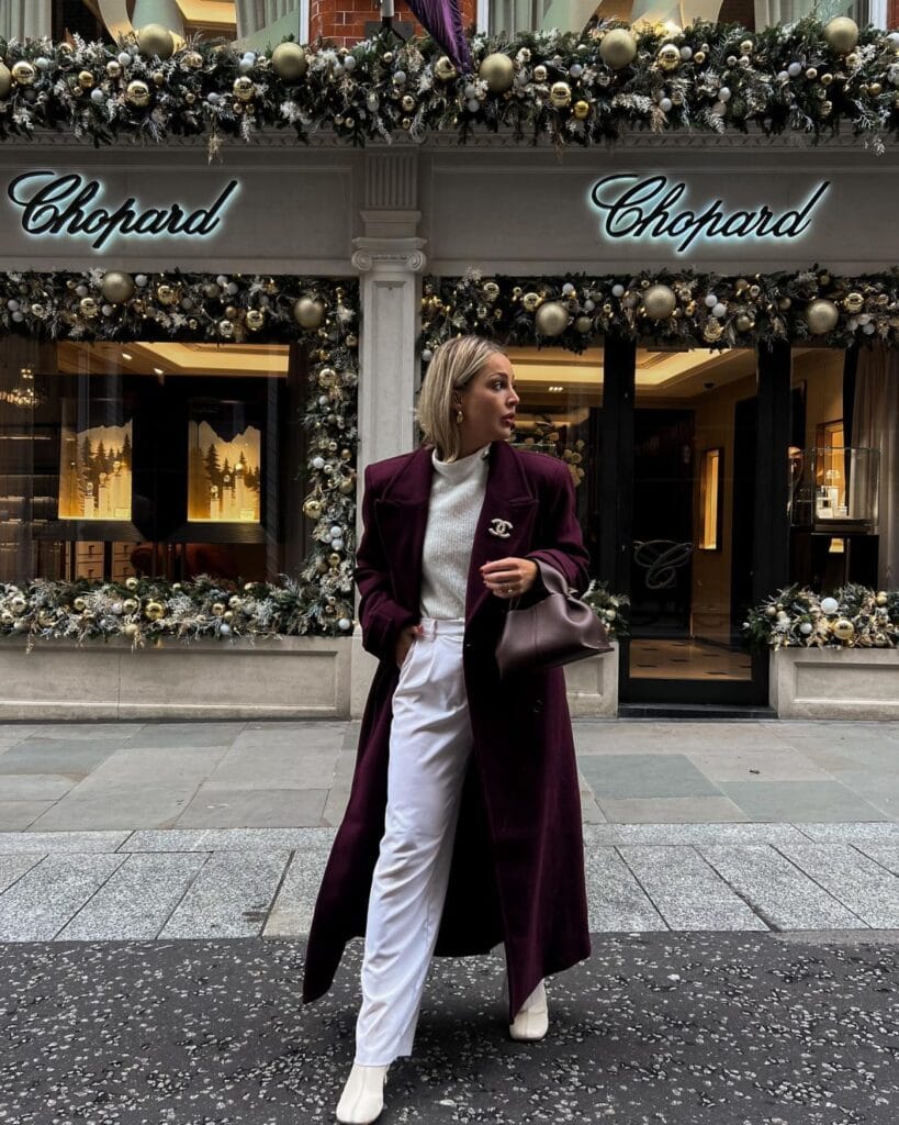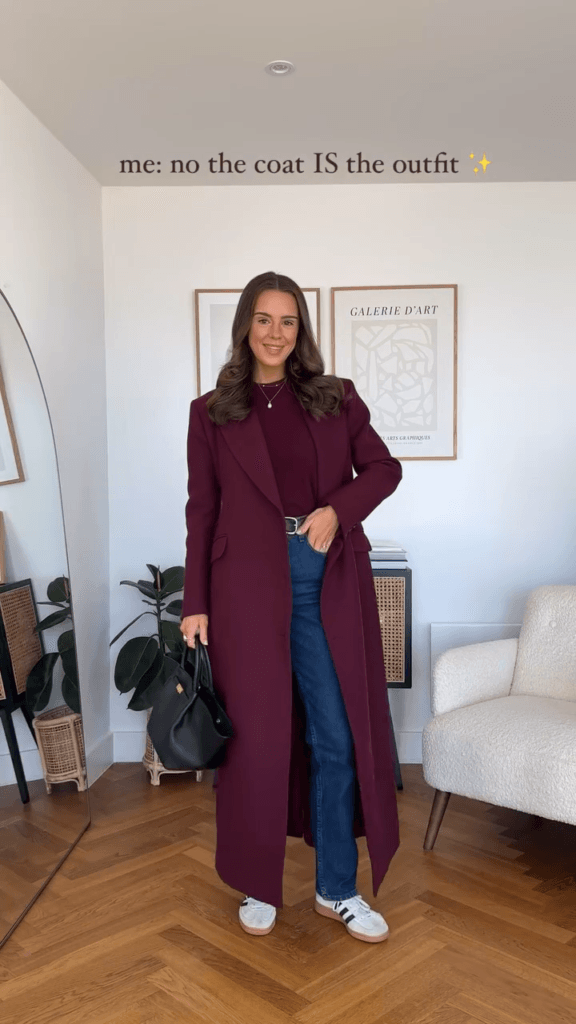 A long, tailored burgundy coat steals the spotlight in this luxe outfit.