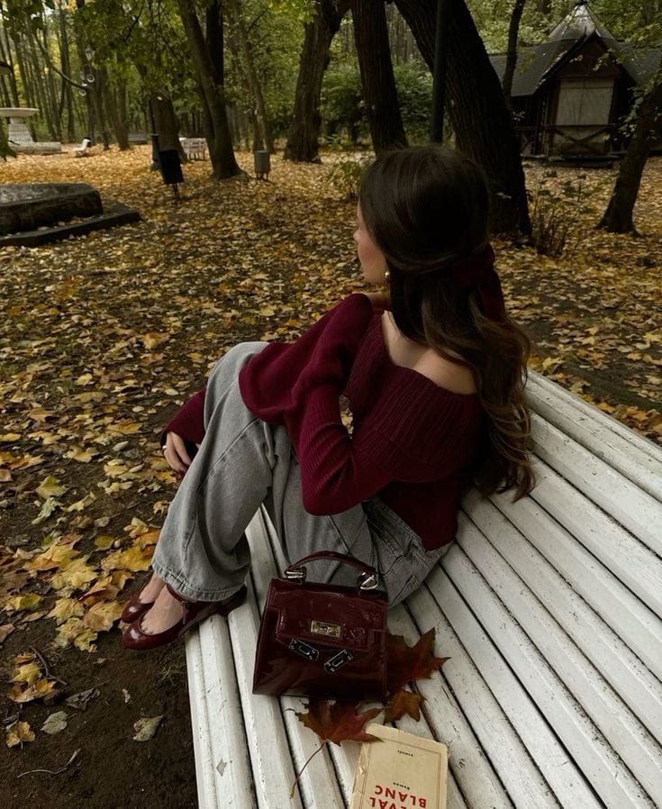 A cozy burgundy sweater styled with oversized jeans delivers the ultimate casual vibe for a stroll in the park.