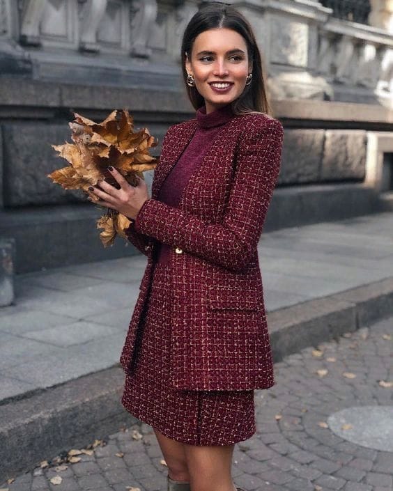 This chic tweed suit in burgundy exudes sophistication. The matching blazer and mini skirt, paired with a cozy turtleneck, make it perfect for chilly fall afternoons.