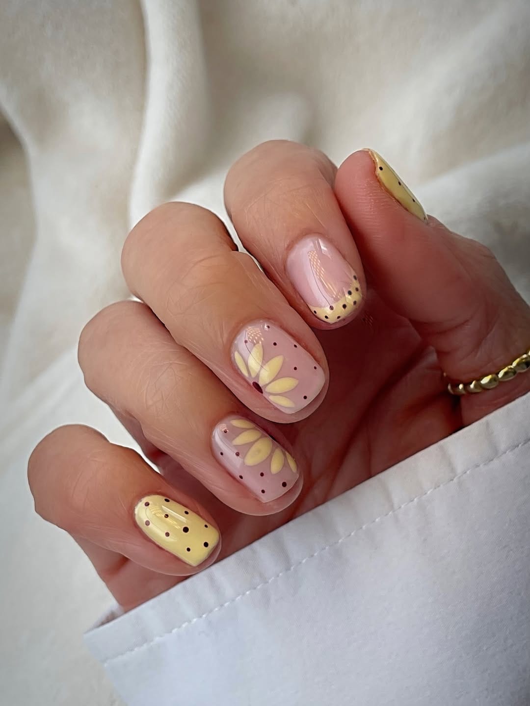 Short square nails alternate between a full solid butter yellow base scattered with tiny dark polka dots, a sheer pink base with large butter yellow sunflower petals painted across two nails, and a butter yellow French tip with a fine dot border at the smile line.