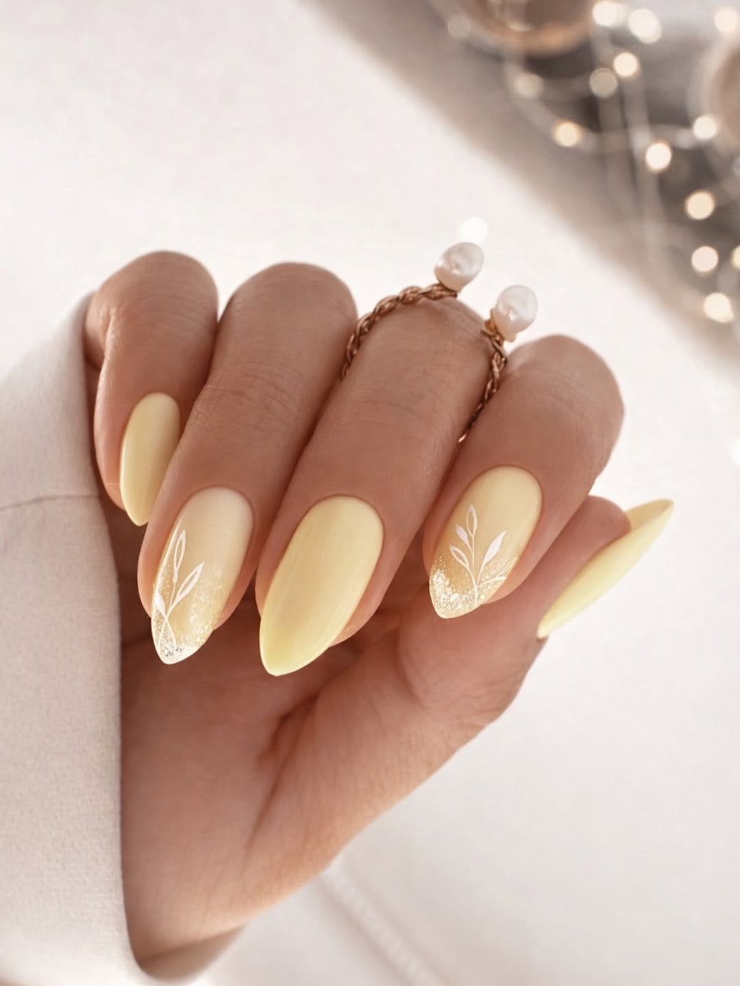 Long almond nails are painted in a matte butter yellow finish, with two accent nails featuring a soft gold glitter base and fine white botanical leaf branches painted with quiet precision.