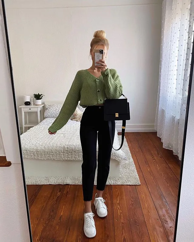 14. Green Cardigan and Pants: A Stylish Pop of Color