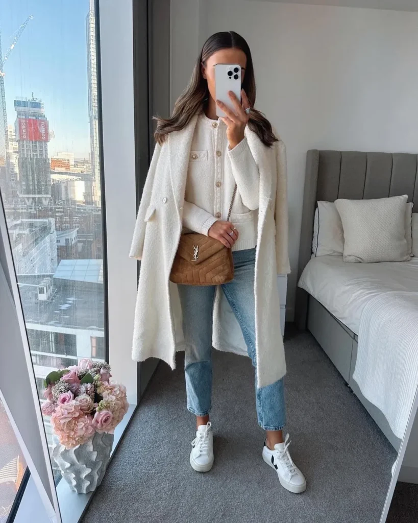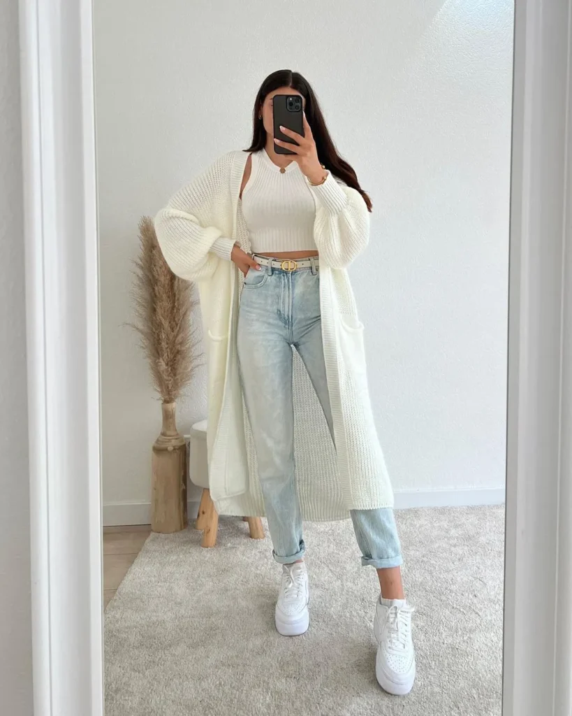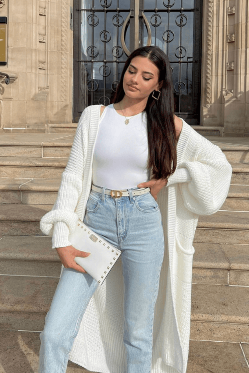8. Elevate Your Look: White Top, Jeans, and a Long White Cardigan