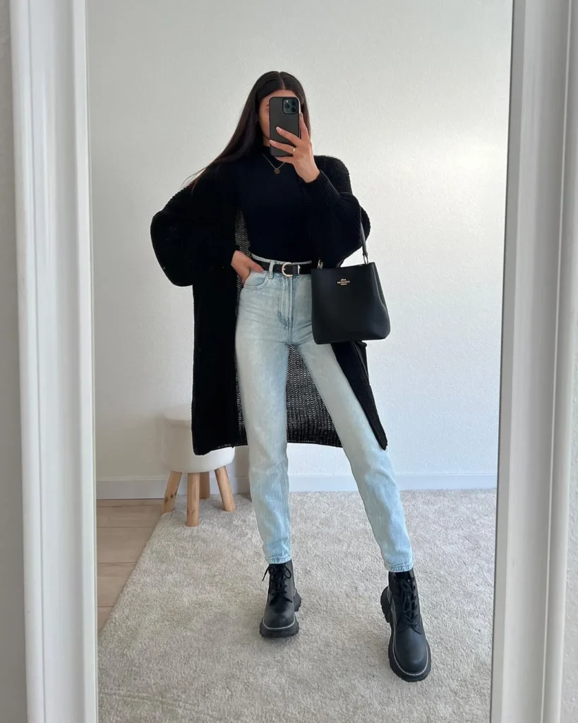 11. Sleek and Edgy: Long Black Cardigan with Bodysuit, Blue Jeans, and Chunky Black Boots