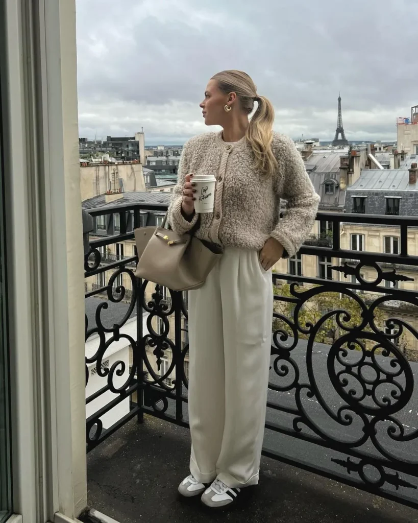 Wrap yourself in cozy vibes with a fuzzy cardigan paired with crisp white pants.