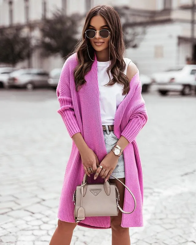 Drape a pink long cardigan over a crisp white outfit for a look that’s both fresh and stylish.