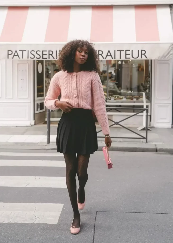 21. Sweet and Chic: Baby Pink Cardigan with a Skirt