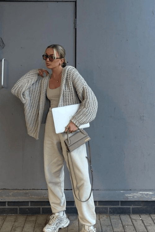 Achieve the perfect blend of comfort and style with an oversized cardigan paired with joggers.