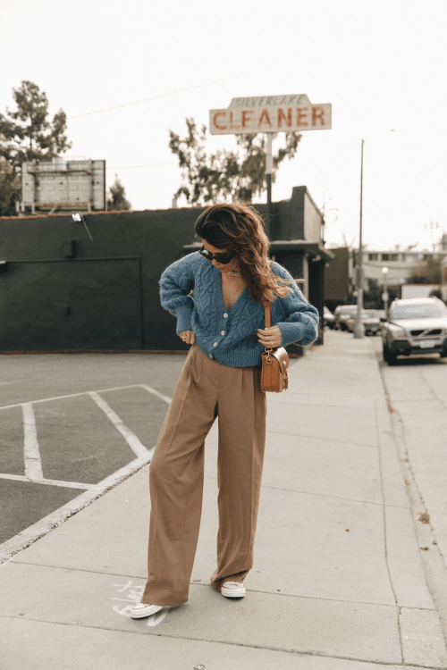Opt for a sophisticated ensemble with a cardigan paired with wide-leg pants.