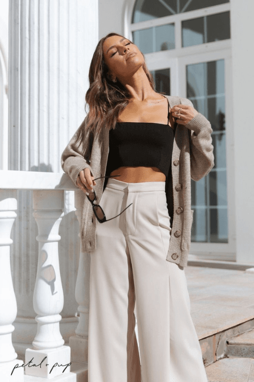 Achieve a chic and sophisticated look with a neutral cardigan paired with wide-leg pants.