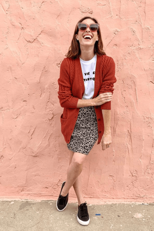 29. Casual Chic: Cardigan, T-Shirt, and Leopard Mini Skirt