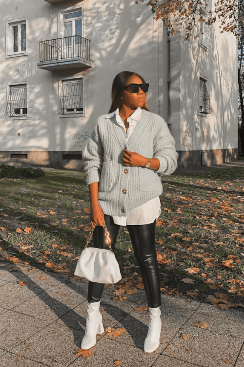 Create a stylish layered look by pairing a cardigan over a shirt with leather leggings.