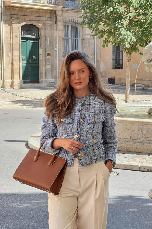 A tweed cardigan paired with pants is a timeless and versatile look. Perfect for the office or a smart-casual outing, this outfit exudes confidence and sophistication.
