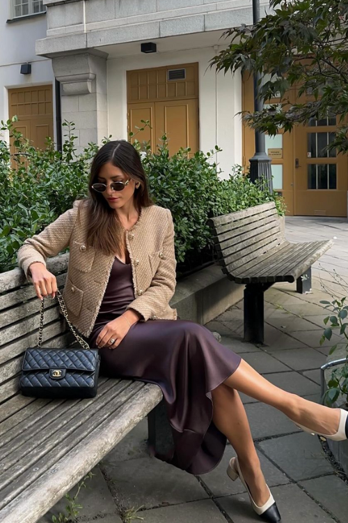 Layer a tweed cardigan over a satin dress for an effortlessly chic outfit. The tweed adds structure and warmth, while the satin provides a luxurious feel.