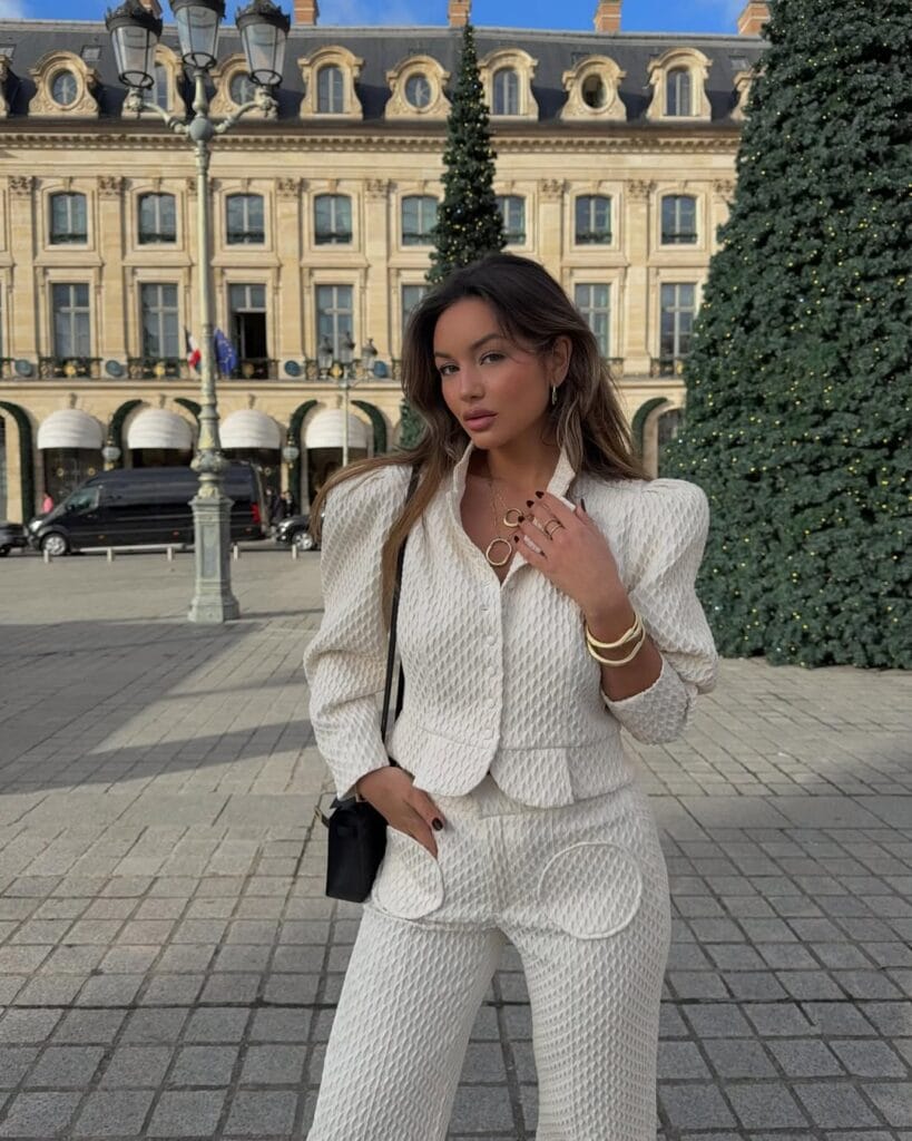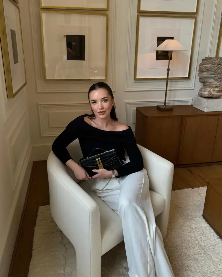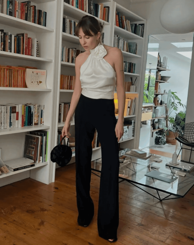 This look is so timeless! She’s wearing a stunning white halter neck top tucked into classic black wide-leg pants—definitely chic enough to have you turning heads at any New Year’s Eve gathering.