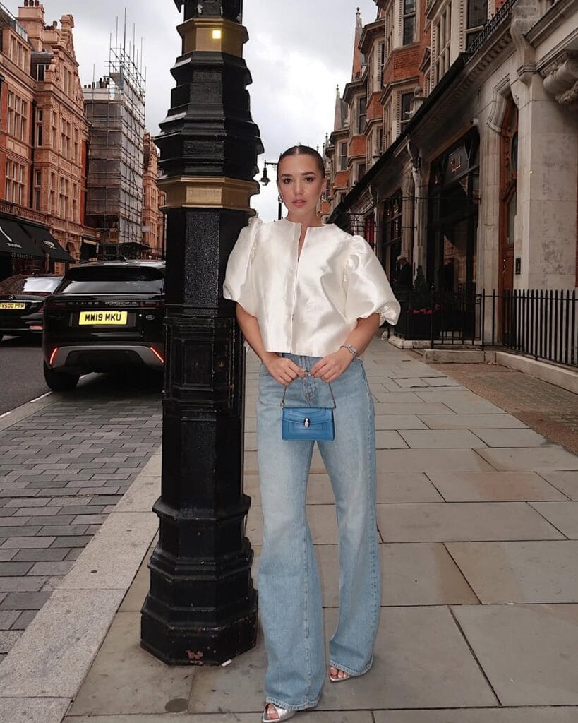 25. Satin Puff-Sleeve Top and Light Wash Jeans