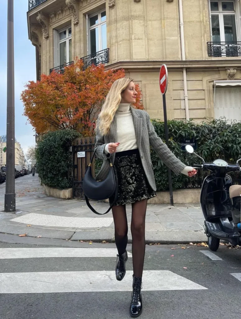 This look totally screams city cool! She’s wearing a classic checked blazer over a light turtleneck top, paired with a glam black sequin mini skirt and sheer tights—perfect for a night out, with all the festive sparkle.