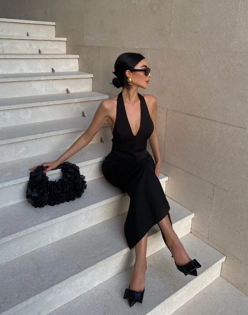 How stunning is this look? She’s wearing a super sleek black halter-neck midi dress—totally sophisticated and perfect for an elegant New Year’s Eve vibe.