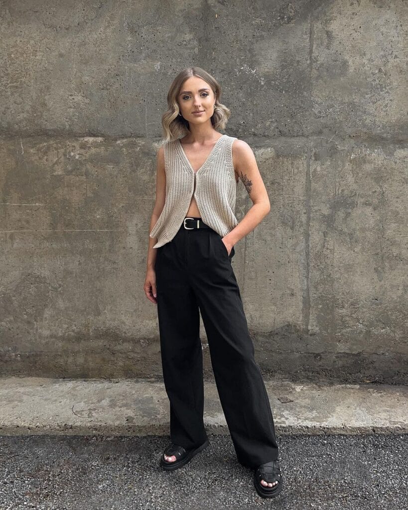 4. Effortlessly Cool: Sleeveless Top with Open Front + Stylish Black Pants Combo