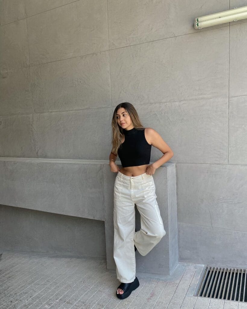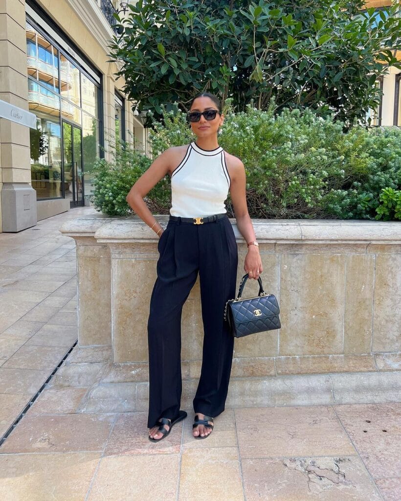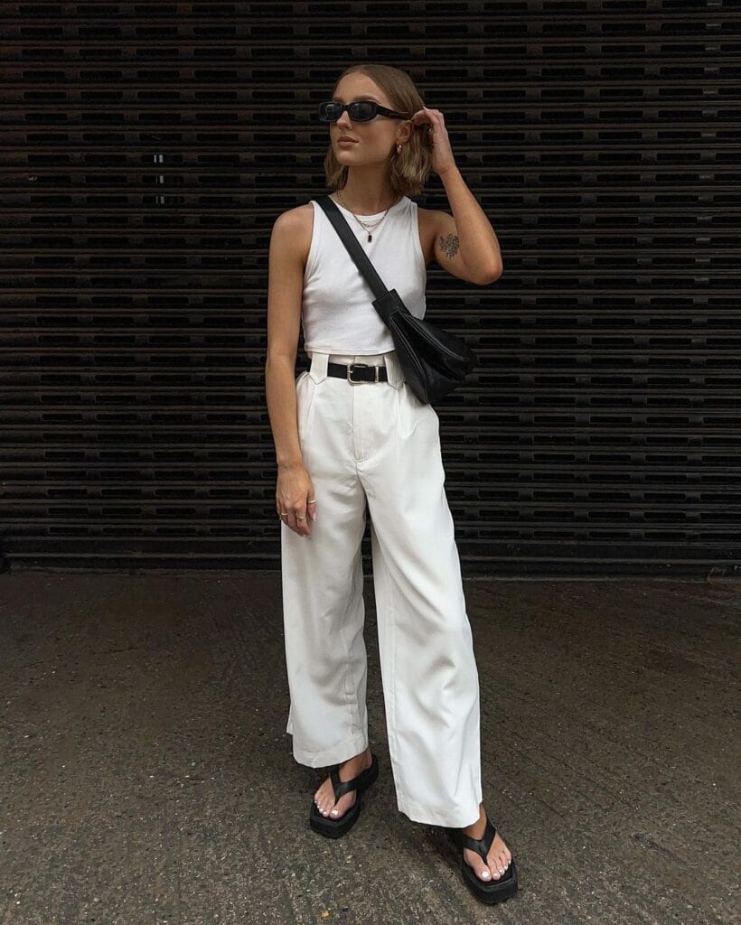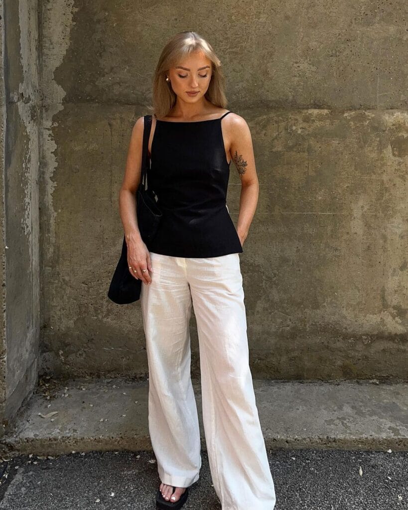 Make a statement in monochrome with a sleeveless black top paired with flowy white wide leg pants, creating a chic and sophisticated ensemble that’s both versatile and trendy, adding a pop of color with vibrant accessories for a bold finishing touch.