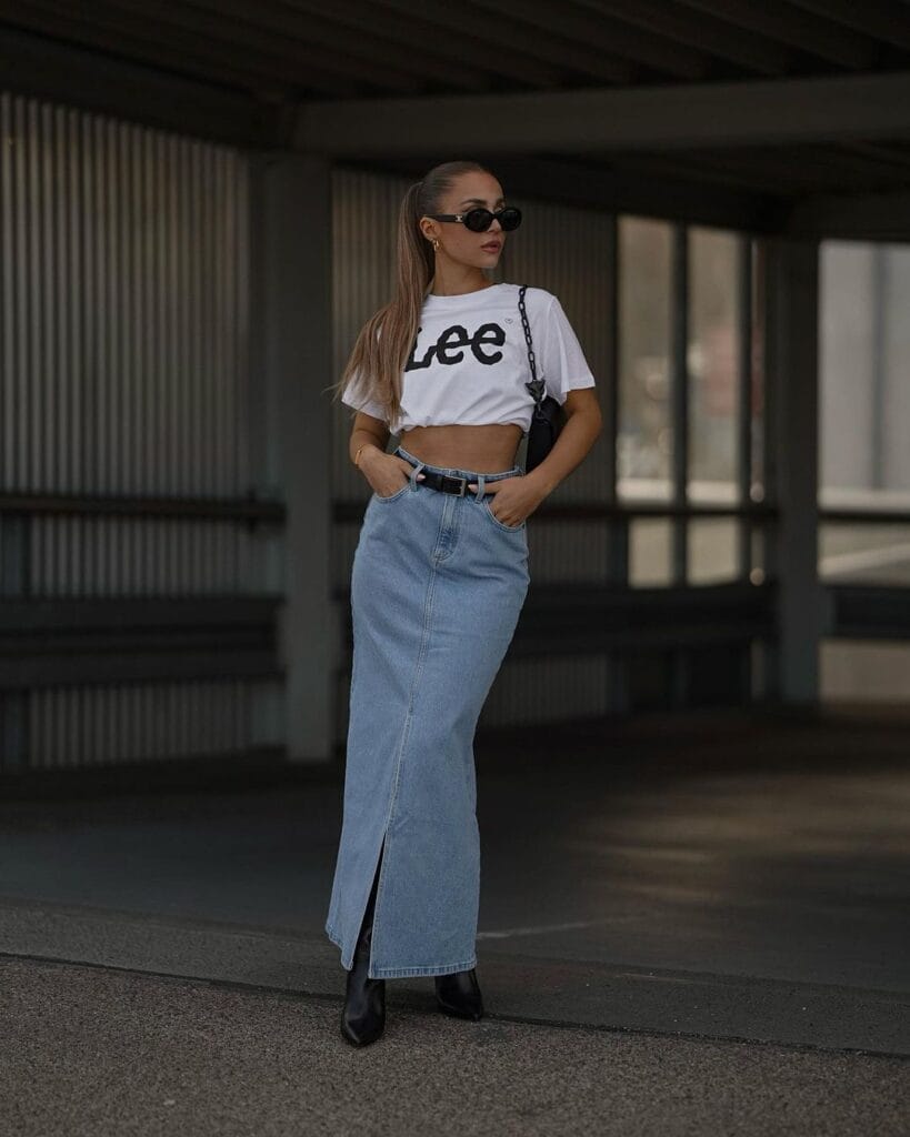 White Crop Top Paired with a Long Denim Skirt Featuring a Flattering Slit, accessorize with beaded jewelry and espadrilles for a bohemian vibe, or add a wide-brimmed hat and ankle boots for festival-ready style.