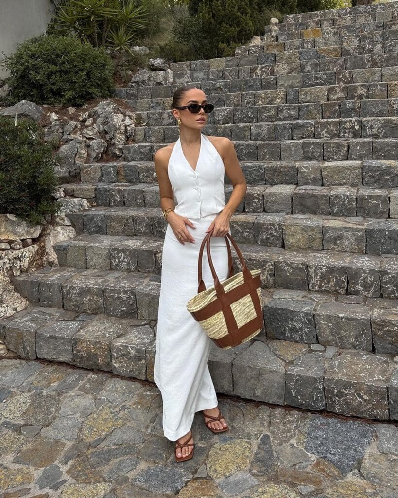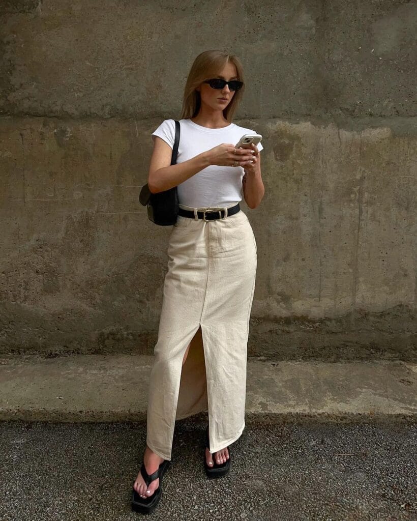 Achieve timeless allure by pairing a white tee with a beige maxi skirt featuring a slit, effortlessly blending comfort and sophistication for any summer occasion, accessorize with layered necklaces and sandals for a bohemian touch.