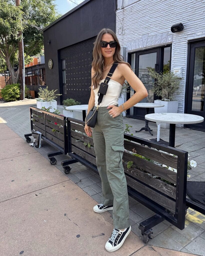 Sleeveless White Top Paired with Olive Green Pants, accessorize with gold jewelry and tan sandals for a touch of elegance, or layer with a denim jacket for a casual-cool vibe, perfect for a weekend getaway.