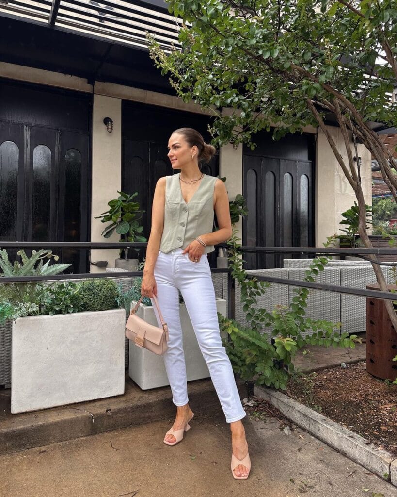 32. Effortlessly Chic: Sleeveless Front-Opening Top Paired with White Denim for a Contemporary Look