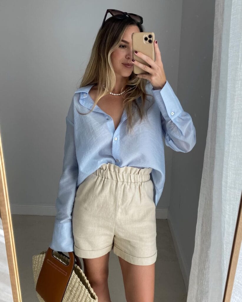 Channel laid-back vibes with a blue shirt paired with high waist shorts, offering a relaxed and chic look perfect for sunny days spent exploring the city or relaxing at the beach, add a floppy hat and sunglasses for extra style points.