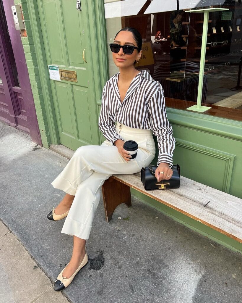 21. Timeless Stripes: Striped Shirt Styled with White High Waist Pants for a Classic Ensemble