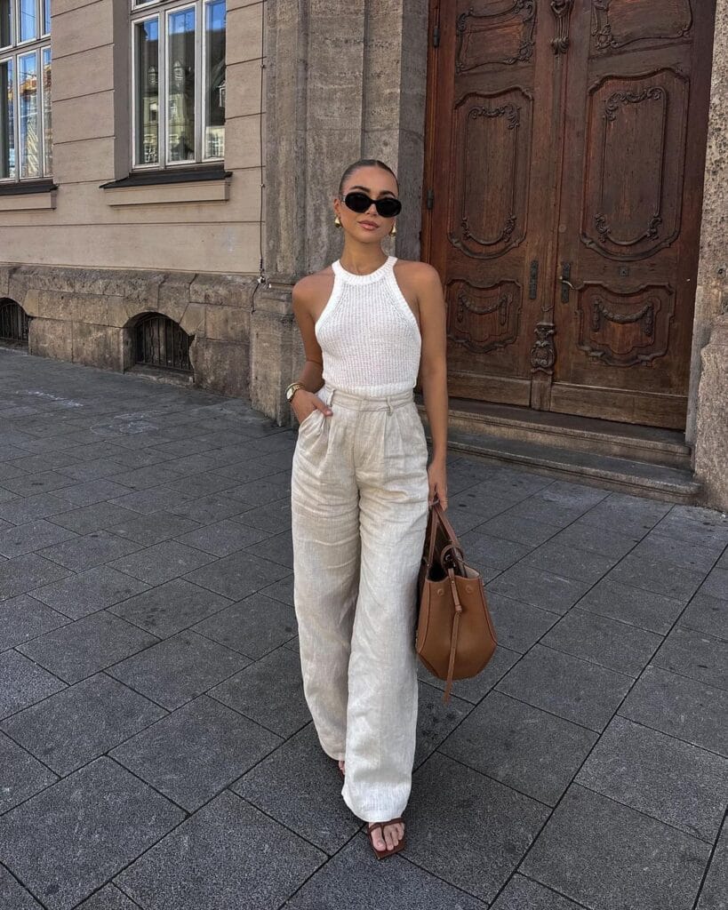 26. Casual Elegance: White Tank Top Matched with High Waist Wide Leg Pants