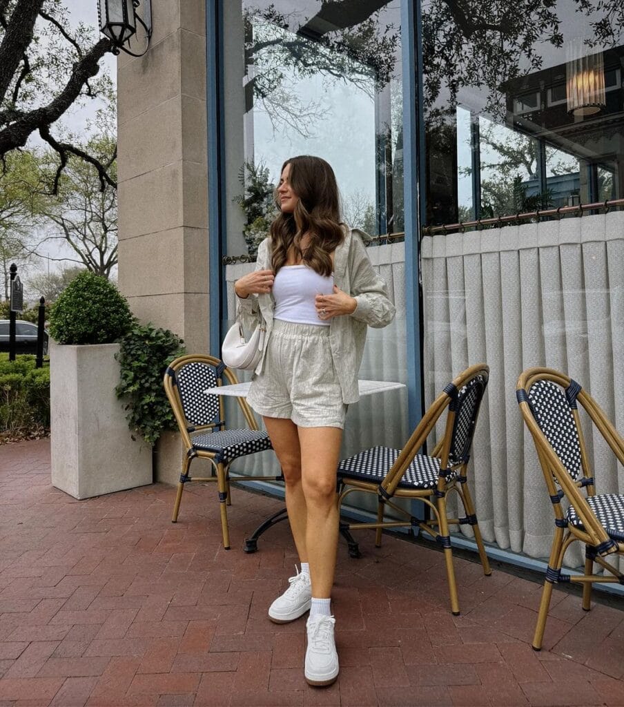 Infuse your summer wardrobe with playful energy by matching a striped top with comfy shorts, creating a fun and vibrant look that’s perfect for picnics in the park or weekend brunch with friends, elevate the outfit with statement earrings and espadrilles.