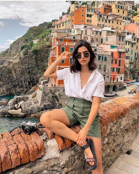White Shirt Teamed with Olive Green Shorts for a Timeless Summer Look, layer with a denim vest and sneakers for a casual-cool vibe, or add a straw hat and sandals for a laid-back summer outfit, perfect for a day of outdoor activities.