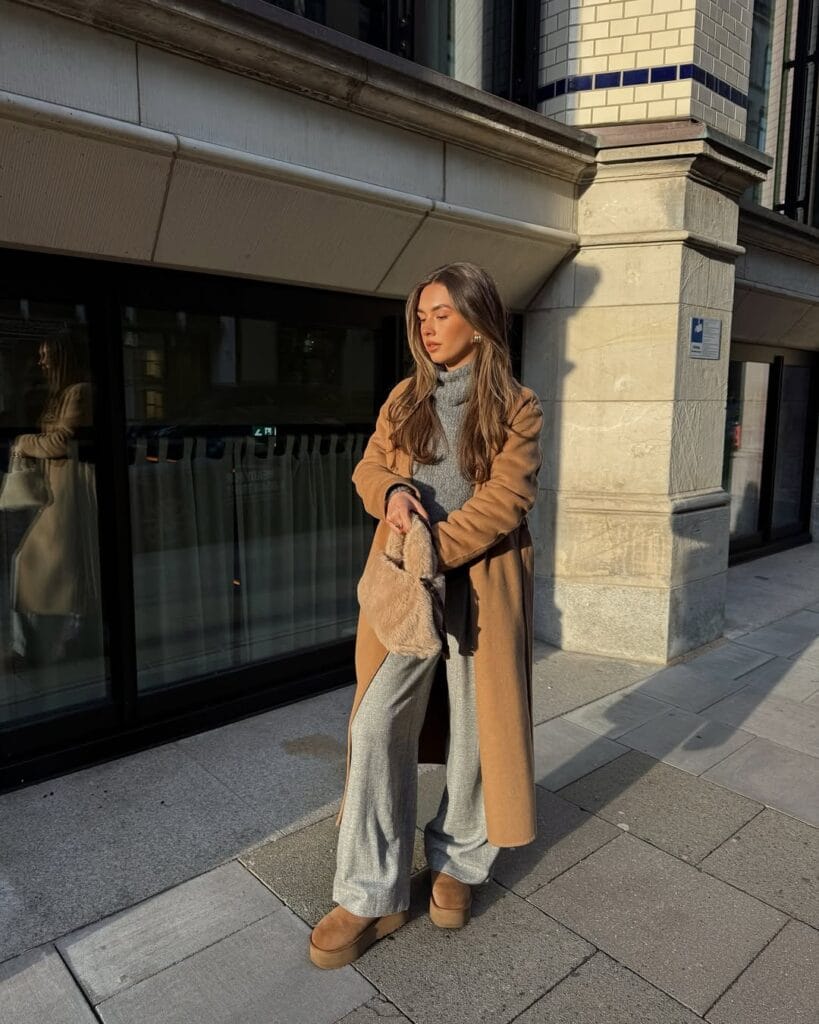 Sheās all bundled up in a classic camel full-length coat over a soft grey knit setāthink wide-leg pants and a cozy turtleneck. The look is finished off with plush tan platform boots, super chill and effortlessly stylish for brisk winter walks or errands!