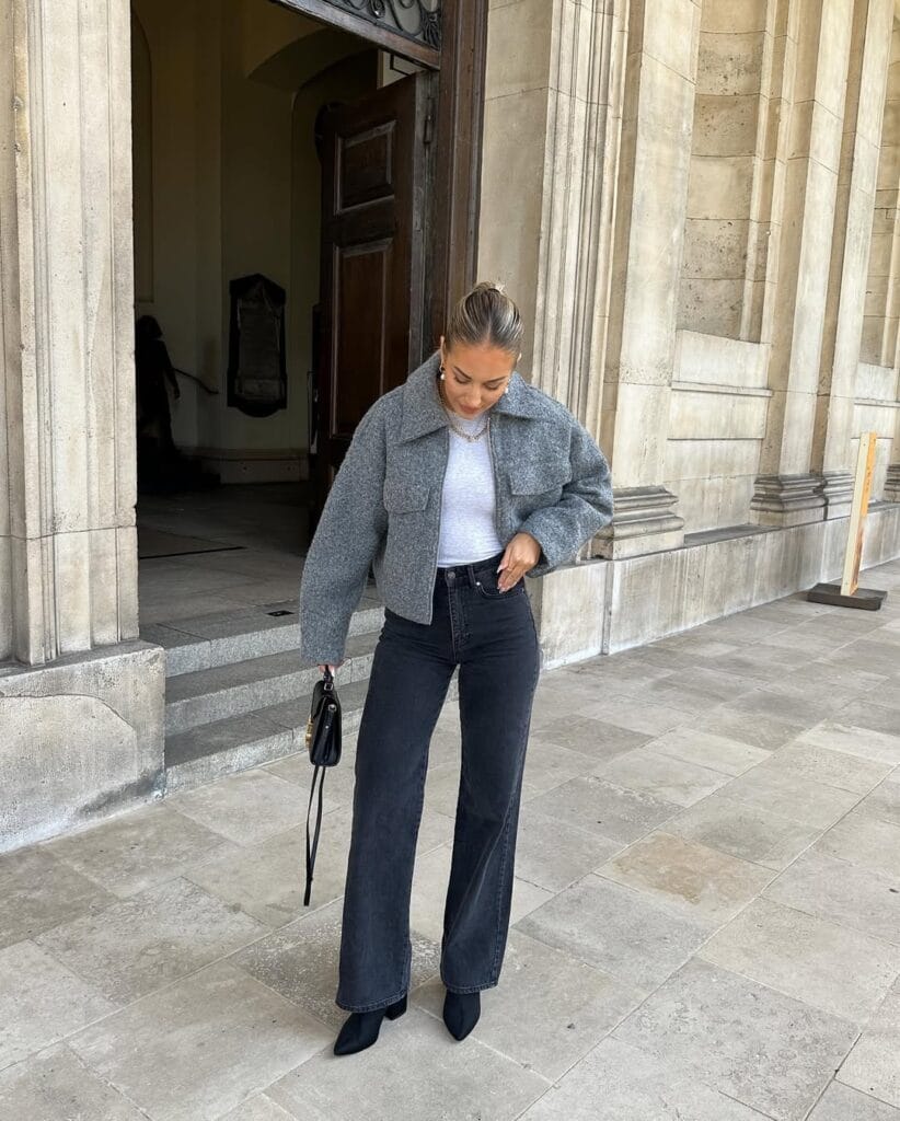 14. Cool-Girl Gray Wool Jacket and Vintage Black Denim