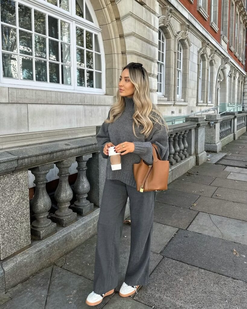 This ultra-comfy look pairs a slouchy charcoal knit turtleneck with matching wide-leg pants, finished off with crisp white sneakers. Itās perfect for those coffee runs or casual days out when you just want to keep it easy and effortlessly put-together!