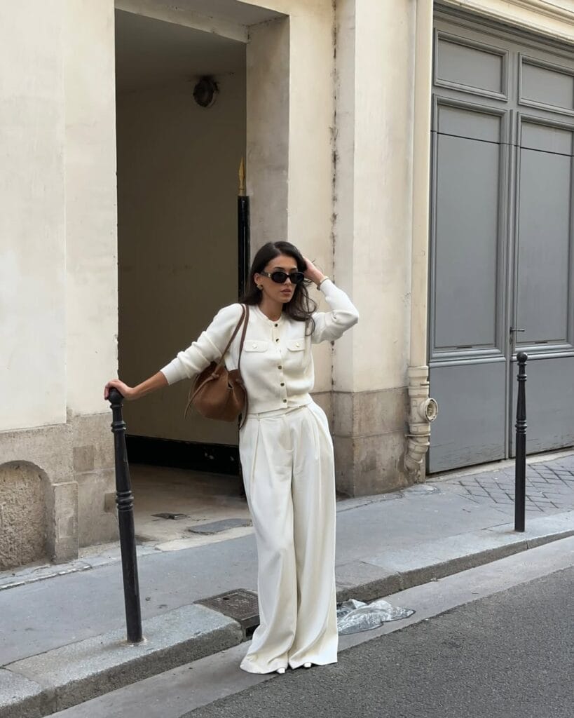 20. Crisp Ivory Cardigan and Flowing Wide-Leg Pants