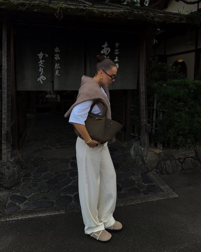 This look balances a white tee with flowy cream wide-leg trousers, topped off with a cozy taupe sweater casually draped over the shoulders. The whole vibe is easygoing and chicāso perfect for a relaxed winter day or exploring cute city spots!