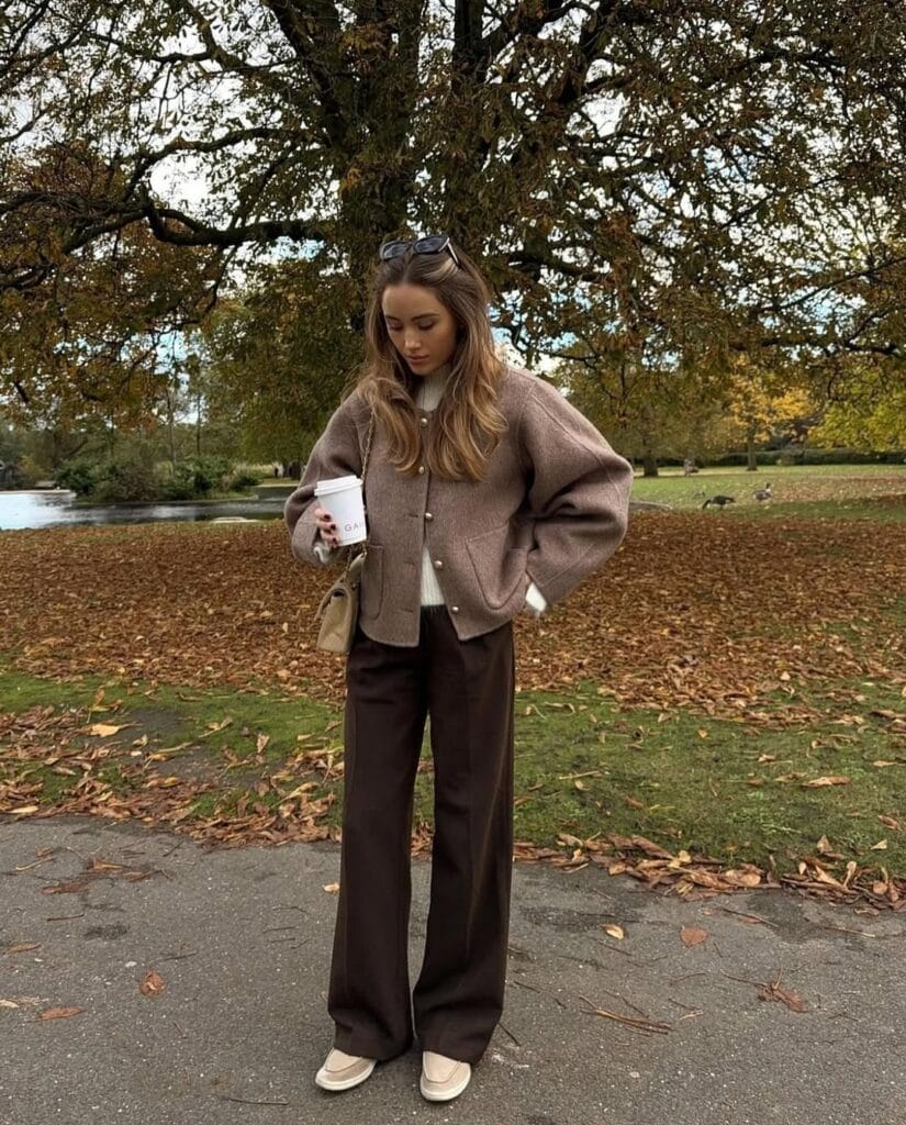 This cozy look layers a mocha wool button-up cardigan over an ivory sweater, paired with wide-leg chocolate brown trousers and creamy loafers. It feels relaxed but super put-togetherāso dreamy for a crisp winter park walk or your morning coffee run!