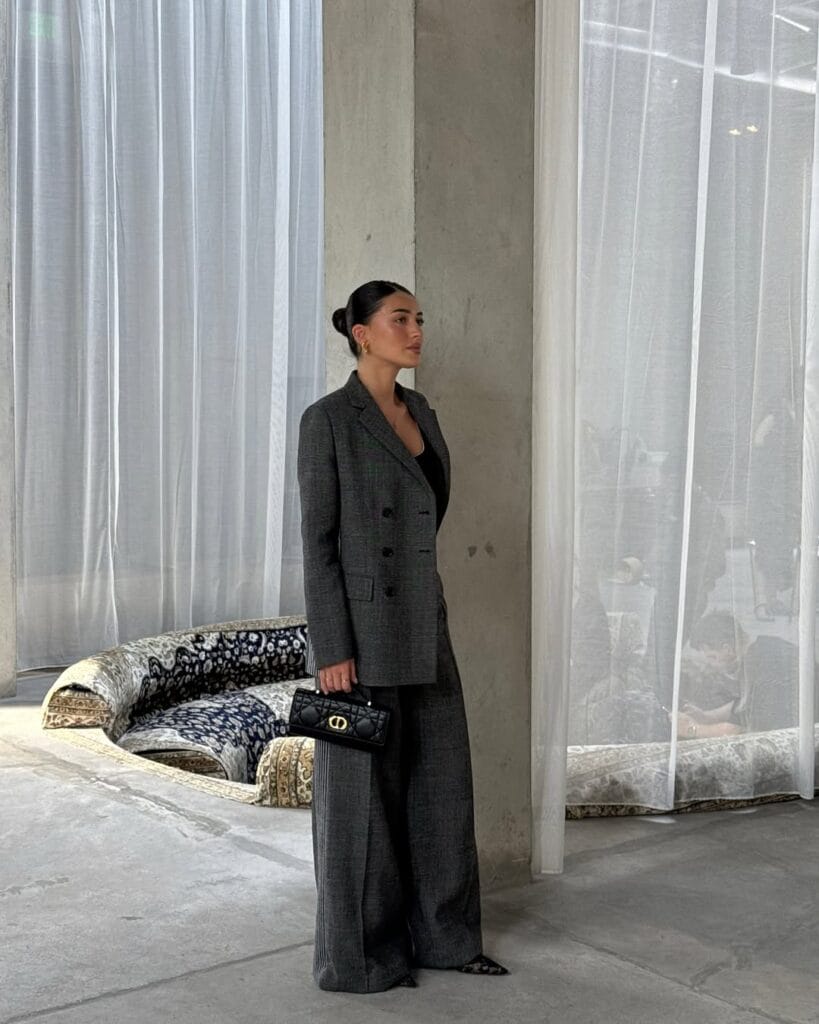 This sharp outfit features a double-breasted charcoal blazer and wide-leg matching trousers, with a simple black top underneath. The vibe is totally business-chicāperfect for when you want to channel major confidence and elegance, whether itās at work or out for fancy dinner plans!