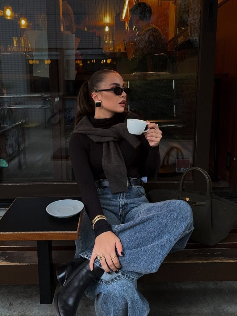 This casual-cool outfit features a fitted black knit top paired with high-rise, wide-leg faded blue jeans and polished black boots. Topped with a matching black sweater around the shoulders, it’s a go-to look for cozy coffee shop hangs or catching up with a friend downtown!