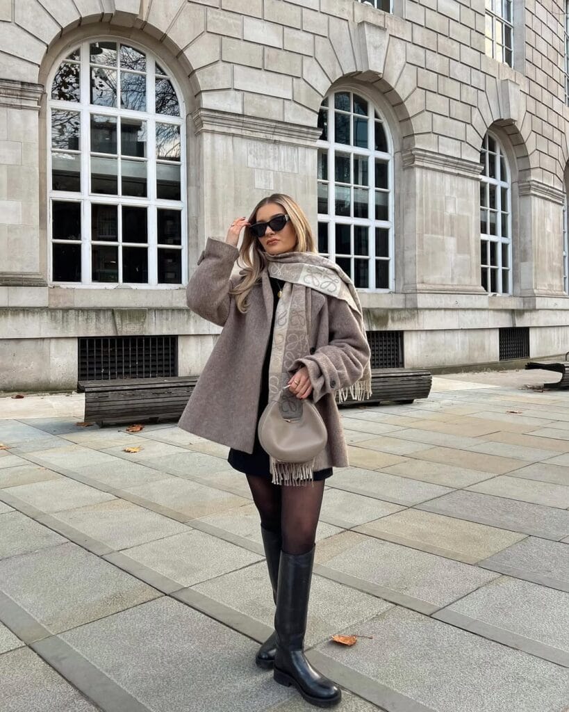 This look is winter layering perfectionāa taupe wool coat draped over a black mini with sheer tights, finished off with tall black boots and an elegant patterned scarf. Effortless, refined, and perfect for a stroll through crisp city air or a coffee catch-up with your besties!