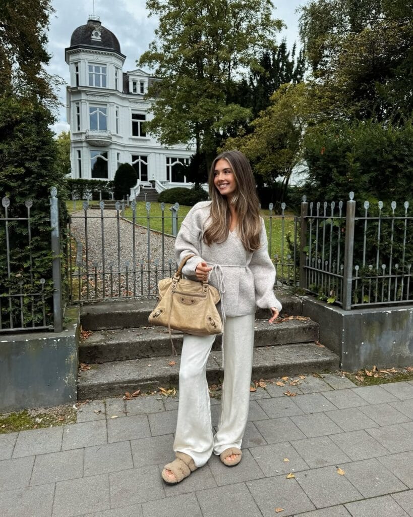 Sheās rocking a plush taupe wrap cardigan and super-comfy cream wide-leg pants, with fuzzy slides for that extra laid-back vibe. This look is giving at-home luxury meets casual strollācouldnāt be cozier for winter days when you want to keep things effortlessly chic!