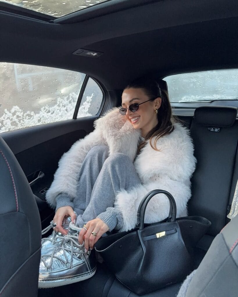 This laid-back winter look features an ultra-soft white faux fur coat over cozy grey knit joggers and a matching sweater. Chunky silver sneakers give it that street-cool edge, making it perfect for lounging in style or road-tripping with your bestie!