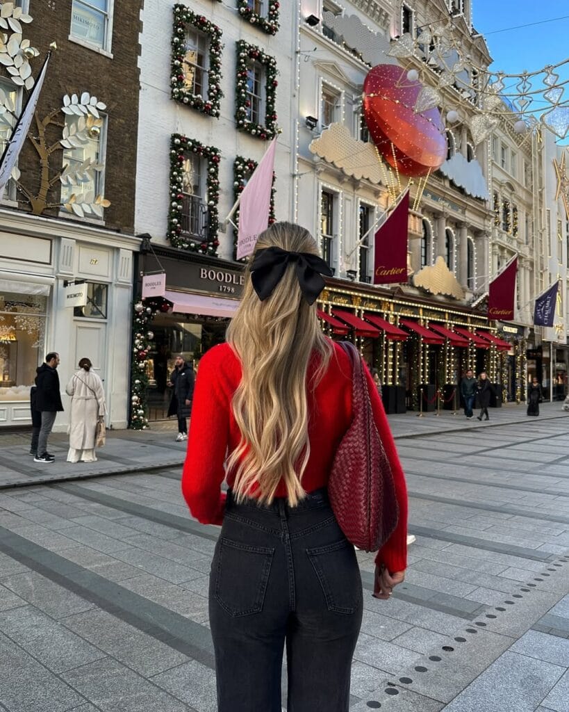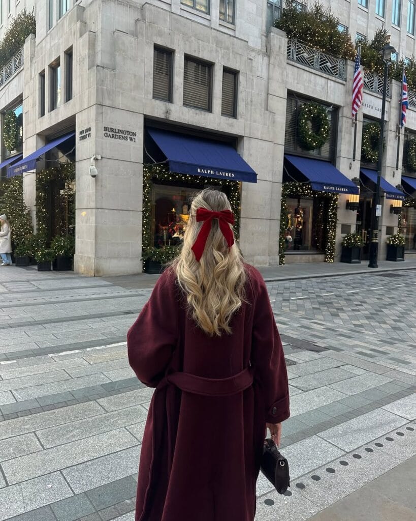 Golden blonde hair flows in soft, bouncy waves, swept half-up and finished with a rich cranberry red velvet bow for festive charm. This romantic style glows under holiday lights, making it a classic, Pinterest-perfect look for Christmas walks and seasonal celebrations.