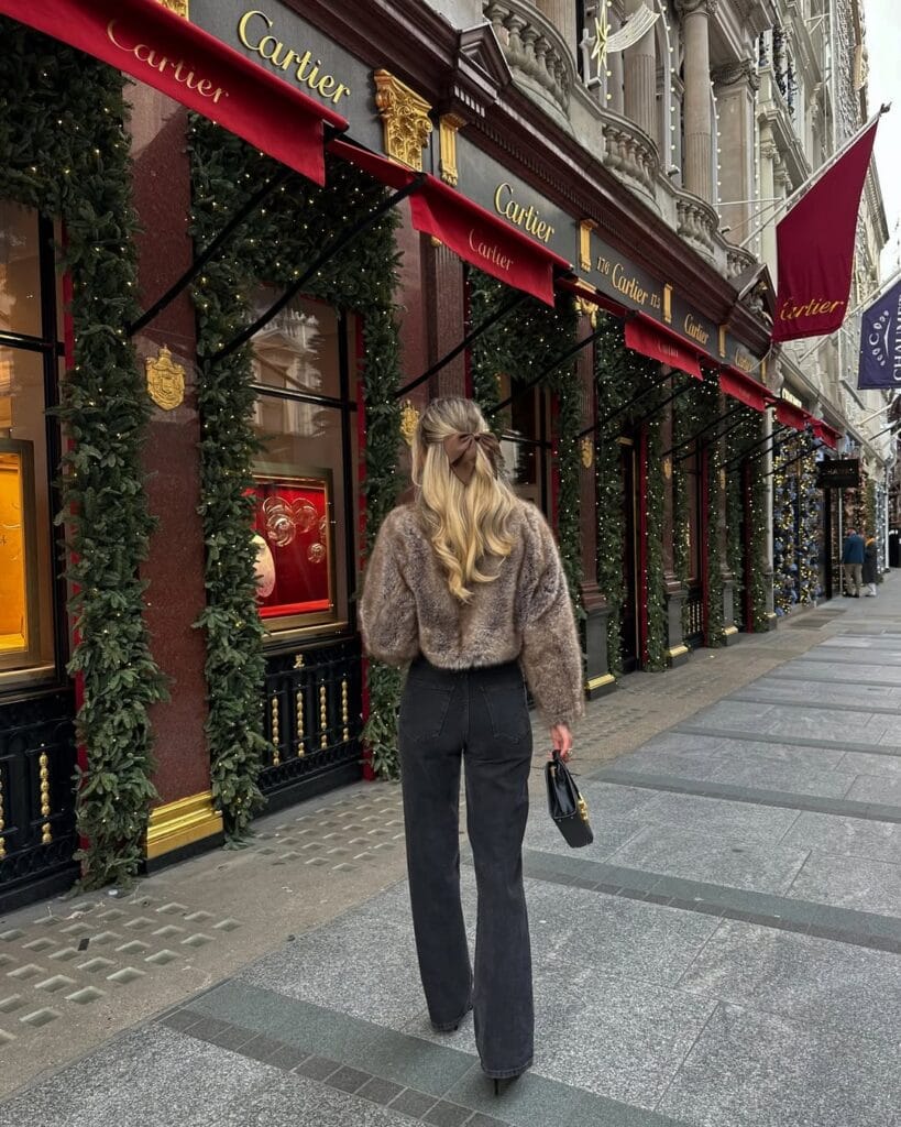 Icy blonde waves are swept half up and crowned with a plush white bow, while a delicate braid adds enchanted detail along the crown. The frosty, fairy-tale vibes and snowy backdrop make this holiday hairstyle a dreamy, Pinterest-inspired look for Christmas strolls or outdoor celebrations.
